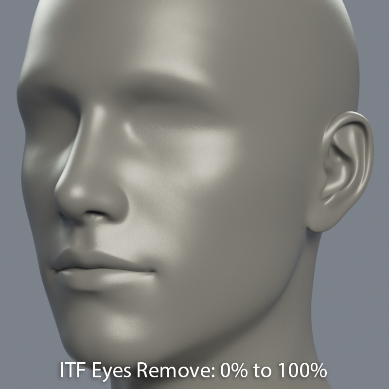 - ITF Eyes Remove: Completely removes Eyes, resulting in a smooth flattened surface. Intended as a base for further sculpting, this morph only works well with the default Genesis 8 Male base shape.