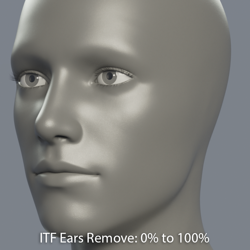 - ITF Ears Remove: Completely removes Ears, resulting in a smooth flattened surface. Intended as a base for further sculpting, this morph only works well with the default Genesis 8 Male base shape.