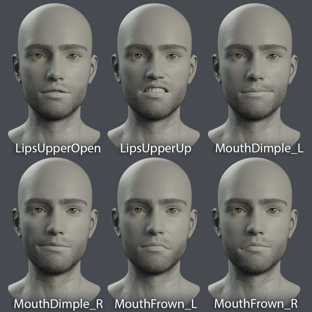 Custom sculpted based on FACS (Facial Action Coding System), these expressions will add additional realism to your facial animations or poses.